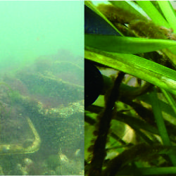 ★播種したアマモ:【写真左】7月の生育状況 ⇒ ⇒ ⇒ ⇒ ⇒ 【写真右】8月の流出状況